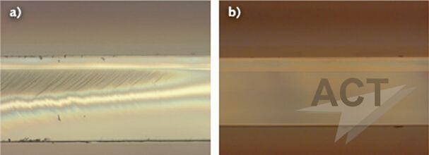 圖1:利用Nomarski微分干涉差顯微鏡觀察的0.7 mm厚康寧CT24玻璃的橫截面圖。CO2激光器切割的樣品表現(xiàn)出殘余應(yīng)力(a),而利用CO激光器進(jìn)行的切割沒有缺陷(b)。