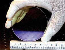 圖1:摻Y(jié)b3+的CaF2 晶體在可見(jiàn)光區(qū)域高度透明[(a);顏色由減反膜引起]。它在近紅外區(qū)域的吸收帶相對(duì)較寬,使半導(dǎo)體激光器泵浦源得以簡(jiǎn)化(b)。 摻Y(jié)b3+增益介質(zhì)的光譜特性導(dǎo)致吸收和發(fā)射的高飽和通量。Yb3+的準(zhǔn)三能級(jí)系統(tǒng)需要5kW/cm2左右的最小泵浦強(qiáng)度,以漂白室溫下激光波長(zhǎng)處的再吸收。這推動(dòng)了對(duì)高亮度激光二極管和兼具低的泵浦亮度損耗、合理的成本和高可靠性的先進(jìn)光束組合系統(tǒng)的需求。